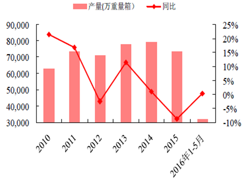 2010-2016年中國平板玻璃產量以及同比增速(單位:萬重量箱)
