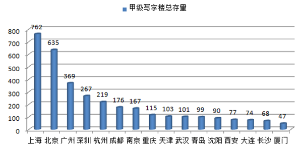 國內(nèi)主要城市場甲級寫字樓總存量情況(萬平米)
