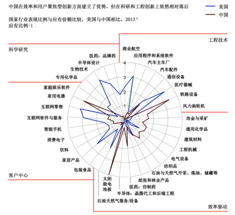 總體偏弱,但在通信設備、鐵路設備、太陽能電池板等產業已達到先進國家水平。根據麥肯錫全球研究院《中國創新的全球效應》,創新主要體現為科學研究、工程技術、效率驅動、客戶中心四個方面。中國前述產業的創新主要體現在效率驅動和工程技術方面的創新,其中通信設備和鐵路設備產業主要體現為工程技術創新,太陽能電池板產業主要體現為效率驅動創新。