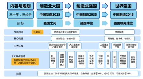 為抓住機遇,順應“工業 4.0”的發展趨勢,實現從制造大國到制造強國的升級目標,我國政府也于 2015 年 5 月公布了《中國制造2025》,作為我國實施制造強國戰略第一個十年的行動綱領。《中國制造 2025》主要內容與規劃如下: