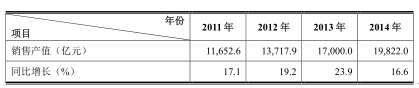 目前,中國通信設備制造業作為高技術產業的重要組成部分,已經形成較為完整的體系,中國逐漸成為世界通信設備加工制造中心。2014 年,我國通信設備行業增速居電子信息產業主要行業之首。通信設備行業銷售產值同比增長16.6%,高出全行業平均水平 6.3 個百分點,通信設備行業銷售產值占全行業比重為 19.5%。2011年至 2014年,我國通信設備行業銷售產值情況如下表: