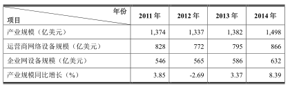 全球通信設備產業主要分為運營商網絡市場及企業網市場。受全球經濟環境的影響,2007 年至 2013 年,全球通信設備產業進入低速增長軌道,年均增長僅 0.4%。其中,運營商網絡設備規模年均下降 1.6%;企業網設備規模年均增長 3.7%。 1 受 4G網絡建設驅動及移動互聯網、云計算、大數據、SDN 等新技術和業務普及帶來的產業融合與市場范圍擴大的驅動,2014 年,全球通信設備產業規模出現明顯增長,同比增長 8.39%,達 1,498億美元。其中運營商網絡設備規模為 866億美元,企業網設備規模為 632億美元。2011 年至 2014年,全球通信設備產業規模情況如下表所示 2 :