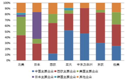 運營商網絡市場方面,近年來,我國主要企業取得快速突破,全球市場份額接近 30%,僅次于西歐主要企業,位居全球第二,領先于美國、日本和韓國主要企業。在國內,我國企業已經占據超過 60%的系統設備市場。在發展中國家,我國設備企業在亞太、中東及非洲市場占比接近 50%,在拉美市場占比超過 25%。在發達國家,我國企業的市場滲透還存在一定困難,一方面,由于美國的限制,我國設備企業進入利潤豐厚的北美市場面臨較大困難;另一方面,我國企業雖然在歐洲市場獲得了相當的市場份額,但也面臨貿易保護等制約,進一步拓展市場困難較大。從細分產品領域看,我國企業在固定寬帶接入系統和光傳輸系統上方面實力較強。全球主要國家的主要企業在全球市場的占有率如下圖所示: