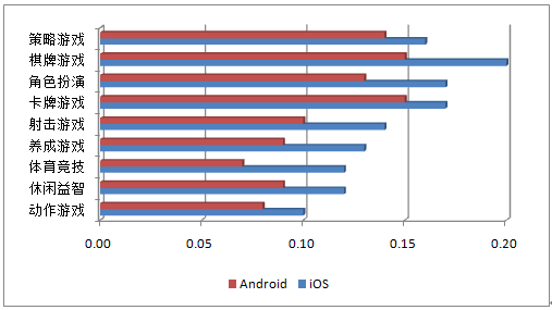 DAU/MAU,一般用來(lái)衡量APP的用戶黏性以及其衰退周期,反映APP的活躍情況。2016年第二季度,iOS平臺(tái)用戶整體表現(xiàn)依然優(yōu)于Android平臺(tái)用戶,在具體類型上,棋牌游戲、卡牌游戲、角色扮演類游戲和策略游戲的玩家黏性較其他類型表現(xiàn)的更為出色。整體上,2016年第二季度,iOS平臺(tái)用戶活躍度較Q1有所上升,而Android平臺(tái)用戶活躍度略有下降。