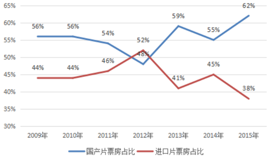 經過近年來的快速發展,我國電影創作生產已初具規模,但其中具備較高商業價值的大制作影片數量仍然較少,距離世界電影強國的電影產量仍有較大差距。據統計,2015 年共上映國產片 373 部,票房總額 271.36 億元,市場份額為 62%,單片平均票房0.73 億元;2015 年共上映進口片 76部(包括 34 部分賬片、27 部批片和 15 部純港、純臺片) ,票房總額169.6億元,市場份額為38%,單片平均票房 2.23 億元。