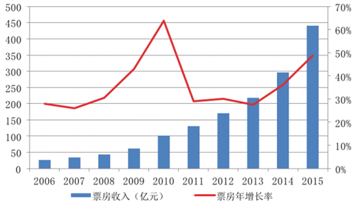 核心提示:自 2006 年至今,我國電影行業處于高速發展階段。2012-2015 年,我國電影市場票房收入分別為170.73億元、217.69 億元、296.39 億元和 440.69 億元;其中,2015年我國電影市場票房收入比2014 年增長了自 2006 年至今,我國電影行業處于高速發展階段。2012-2015 年,我國電影市場票房收入分別為170.73億元、217.69 億元、296.39 億元和 440.69 億元;其中,2015年我國電影市場票房收入比2014 年增長了 49%。總體看來,我國電影票房市場連續十年保持高速增長,是全球票房增長速度最快的市場之一。