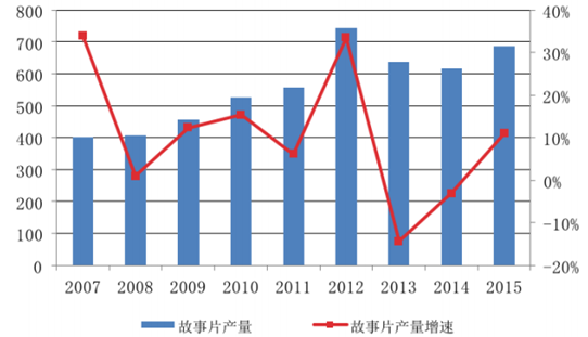 2006 年以來,我國電影創作生產數量呈現先升后降趨勢,2006 年至 2012年始終保持增長態勢,全國故事影片產量由300 部上升至 745 部,平均年增長率為 16.37%。從 2012年開始進入電影產業結構調整時期,國產故事片生產數量由穩步增長變為減量減速, 國產片從數量競爭開始步入單片產出效果和票房競爭階段, 2015 年故事片產量為 686 部, 雖然比 2012 年下降 59 部, 但較 2013 年和 2014年的產量有所提高,產業結構調整取得一定成效。