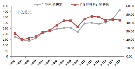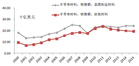 2000-2015年全球半導(dǎo)體晶圓制造材料與封裝材料市場銷售額