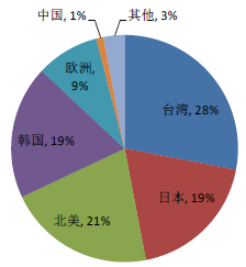 2015 年全球半導(dǎo)體材料市場產(chǎn)值為434 億美元,其中,臺(tái)灣為94.1 億美元,連續(xù)6 年蟬聯(lián)最大市場;而南韓、中國大陸、北美與歐洲都有微幅成長,日本則出現(xiàn)6.28%的衰退幅度。總的晶圓制造材料和封裝材料分別為241 億美元和193 億美元,分別比2014 年衰退1%與2%。
