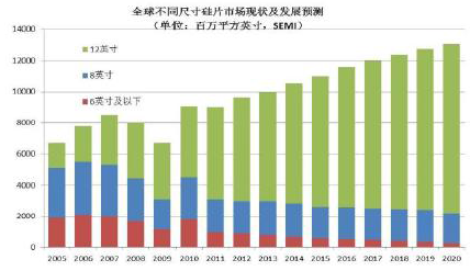 國內(nèi) 2013 年300mm 晶圓月產(chǎn)能接近25 萬片,對300mm 硅片的需求量約30 萬片,按照《國家集成電路產(chǎn)業(yè)發(fā)展推進(jìn)綱要》規(guī)劃目標(biāo),到 2020 年集成電路產(chǎn)業(yè)規(guī)模將達(dá)到 1 萬億元,平均增長幅度為 20%,對集成電路硅片的需求可能要大于20%的增長幅度,那么到 2017 年國內(nèi)對 300mm 集成電路硅片需求量將突破60 萬片 ,市場規(guī)模達(dá)到50 億元;到 2020 年將超過 100 萬片,市場規(guī)模將超過83 億元。