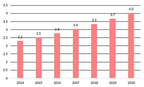全球紅外市場穩中有升,軍用占比較高。2015年全球紅外市場規模達120億美元左右,其中軍用市場規模約為80億美元,未來年均增速4%左右;民用市場規模約38億美元,預計2019年將達到52.19億美元,年復合增長率為9.27%。