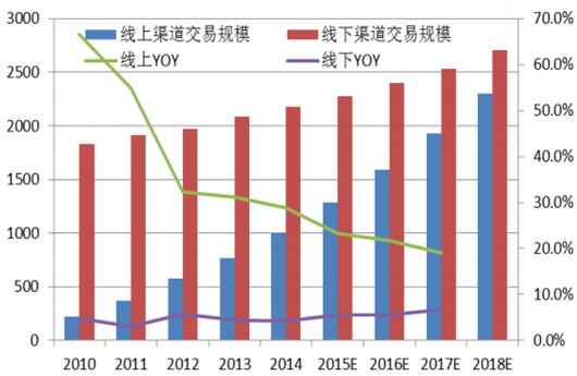 2010-2018年國內化妝品行業線上、線下規模對比(單位:億元)