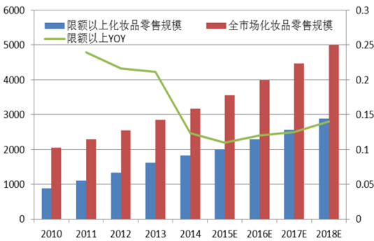 核心提示:國內化妝品市場規模由 2011年 2051.87 億元增長至 2014 年的 3180.3 億元,預計未來三年國內化妝品市場規模將保持約每年 12.3%的增長率,預計 2016 年市場規模將至 4000億元,2018年將突破 5000 億元國內化妝品市場規模由 2011年 2051.87 億元增長至 2014 年的 3180.3 億元,預計未來三年國內化妝品市場規模將保持約每年 12.3%的增長率,預計 2016 年市場規模將至 4000億元,2018年將突破 5000 億元。盡管化妝品銷售總額數目龐大,但藥妝化妝品市場份額依然很小。中國藥妝市場無論從市場容量還是目前的消費意識看,很像十幾年前的女性美容市場,還存在著巨大的潛在發展空間。
