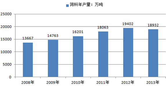 2008 年到 2013年中國飼料年產量情況