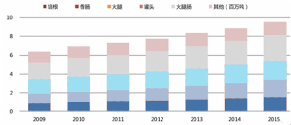 4、消費結構發生較大變化,肉類安全成為居民消費中的首要問題。目前國內肉類市場上中西式肉制品豐富多彩,有醬、鹵、腌、臘、燒、烤、熏、干制等八大類上千個品種,還有很多地方名優風味產品。從 2008 年到 2013 年,中國豬肉制品的消費量從 5.95 百萬噸增加至 8.32 百萬噸,復合增速為 6.94%。根據 Frost & Sullivan 的預計,到 2018 年中國的豬肉制品的消費量有望增長至 11.91 百萬噸。