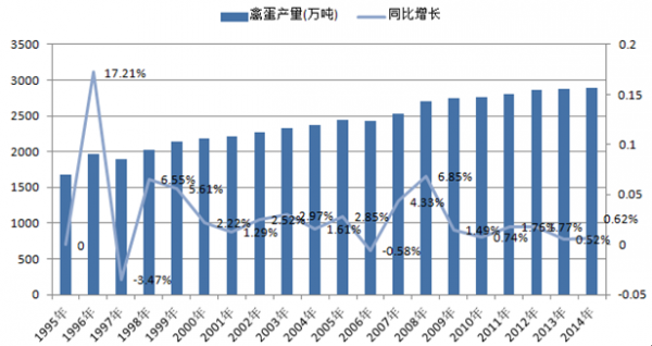1995-2014年中國禽蛋產量及增速統計表