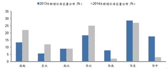 類型含義代表企業運輸型以從事貨物低溫運輸業務為主,包括干線運輸、區域配送以及城市配送雙匯物流、榮慶物流、眾榮物流倉儲型以從事低溫倉儲業務為主,為客戶提供低溫貨物儲存、保管、中轉等倉儲服務太古冷鏈、普菲斯城市配送型以從事城市低溫倉儲和配送一體業務為主北京快行線、上海新天天、深圳曙光綜合型以從事低溫倉儲、干線運輸以及城市配送等綜合業務為主。招商美冷、上海廣德、北京中冷交易型以農產品批發市場為主體從事低溫倉儲業務為主聯想白沙洲、深圳農產品、江蘇潤恒、福建名成供應鏈型圍繞核心企業,通過對信息流,物流,資金流的控制,從采購開始一直到終端整個過程提供低溫運輸、加工、倉儲、配送服務,然后由分銷網絡把產品送到消費者手中的將供應商,制造商,物流商,分銷商,連成一個整體的功能網鏈結構武漢良中行2013-2014年中國新增冷庫容量七大區域分布(%)