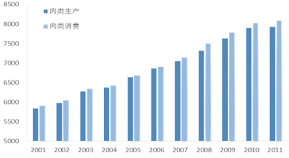 2001至2011年中國肉類生產及消費總量(萬噸)