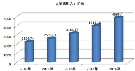 2010-2014年中國肉制品加工行業規模以上企業銷售收入(億元)