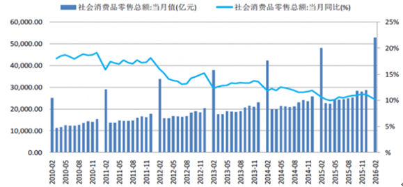 2016 年1-2 月社會(huì)消費(fèi)品零售總額5.3 萬億,同比增速為10.2%,低于2015 年同期水平0.5 個(gè)百分點(diǎn)。歷史數(shù)據(jù)表明,1-2 月的社零總額增速基本處于全年較低水平,在后續(xù)季節(jié)性消費(fèi)的影響下,2015 年社零總額有望保持10%以上的增速。