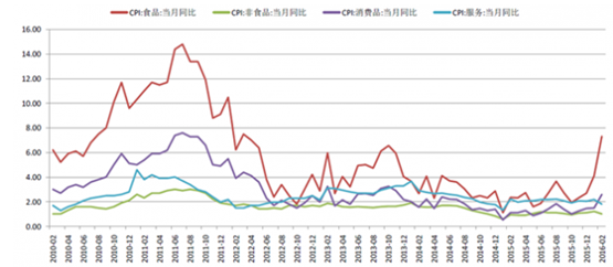 2016 年2 月CPI 同比增長(zhǎng)2.3%,接近兩年前高位。其中,食品類同比猛增7.3%,非食品類同比增長(zhǎng)1.0%,消費(fèi)品同比增長(zhǎng)2.6%,服務(wù)同比增長(zhǎng)1.8%。2 月份CPI 漲幅較大一方面在于春節(jié)期間食品消費(fèi)旺盛,另一方面與貨幣政策偏向?qū)捤捎嘘P(guān),食品價(jià)格上漲帶動(dòng)了CPI 快速回升。