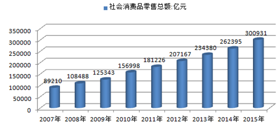 2007-2015年中國社會(huì)消費(fèi)品零售總額走勢(shì)圖