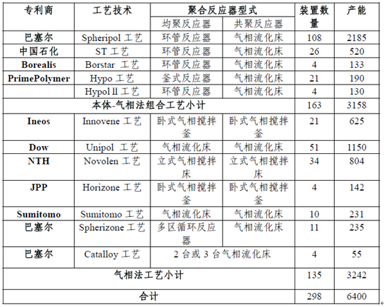世界主要聚丙烯生產(chǎn)工藝技術(shù)及產(chǎn)能(萬噸)