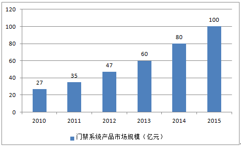 現今門禁系統已經成為各大樓宇建筑時的必選項。從當前的應用來看,以金融、交通、商業寫字樓、政府單位、大型集團公司、房地產、酒店、核電、教育等行業項目對門禁系統有良好的需求熱度。2013年國內門禁系統產品銷售市場規模約為60億元,年增長高達27.66%。2015年我國國內門禁系統產品銷售市場規模約為100億。