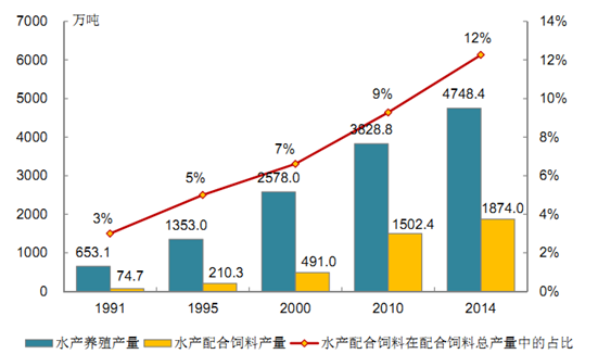 2014 年,全年水產(chǎn)品產(chǎn)量6,461.52 萬噸,比上年增長 4.69%。其中,養(yǎng)殖水產(chǎn)品產(chǎn)量 4,748.41 萬噸,增長 4.55%,占全國水產(chǎn)品總量的 73.49%,占世界養(yǎng)殖水產(chǎn)品總量的 60%以上,是世界唯一養(yǎng)殖產(chǎn)量超過捕撈產(chǎn)量的水產(chǎn)養(yǎng)殖大國。作為水產(chǎn)養(yǎng)殖業(yè)發(fā)展的物質(zhì)基礎(chǔ), 水產(chǎn)配合飼料業(yè)隨養(yǎng)殖業(yè)的快速發(fā)展進(jìn)入了高速發(fā)展時期,成為飼料工業(yè)中增長最快、效益最好、潛力最大的陽光產(chǎn)業(yè)。1991年我國水產(chǎn)配合飼料產(chǎn)量只有 75 萬噸, 僅占我國配合飼料總產(chǎn)量約3%, 到 1999年,其產(chǎn)量已增加至 400 萬噸,占配合飼料總產(chǎn)量的 5.8%,2014 年我國水產(chǎn)配合飼料的產(chǎn)量約為 1,874 萬噸,占配合飼料總產(chǎn)量的 12.26%,23 年間年均增速達(dá)到 15.04%,遠(yuǎn)高于配合飼料整體 9%的平均增速。