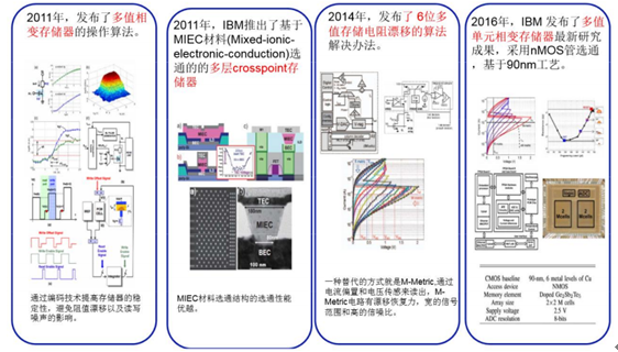 2011 年 IBM發(fā)布了多值的相變存儲(chǔ)器操作算法,然后推出了基于 MIEC 材料選通的多層crosspoint存儲(chǔ)器。 2014年IBM發(fā)布了6位多值存儲(chǔ)電阻漂移的算法解決辦法, 2016年發(fā)布多值相變存儲(chǔ)器,進(jìn)入 90nm 工藝。