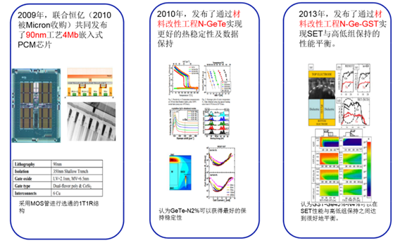 2009 年聯(lián)合恒億共同發(fā)布 90nm 工藝 4Mb 嵌入式相變存儲(chǔ)器芯片;2010 年,發(fā)布了通過材料改性工程 N-GeTe 實(shí)現(xiàn)更好的熱穩(wěn)定性及數(shù)據(jù)保持;2013 年,發(fā)布了通過材料改性工程 N-Ge-GST實(shí)現(xiàn) SET與高低組保持的性能平衡。