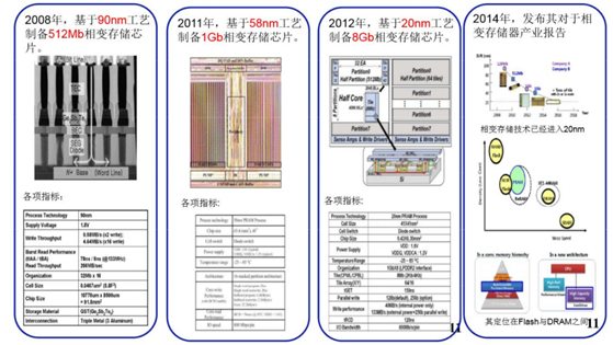 2008年基于90nm工藝制備512Mb相變存儲(chǔ)器芯片; 2011年基于58nm工藝制備1Gb相變存儲(chǔ)器芯片;2012 年基于 20nm 工藝制備 8Gb 相變存儲(chǔ)器芯片;2014 年發(fā)布相變存儲(chǔ)器的產(chǎn)業(yè)報(bào)告。