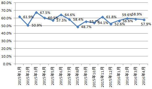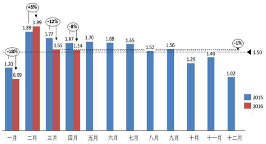 行業利潤增速放緩。2016 年1-4 月,全行業汽車制造的銷售利潤率和成本費用率相對平穩,但是銷售增長率和銷售利潤增長率均呈現同比下滑態勢。從汽車工業重點企業(集團)來看,1-4 月份累計實現營業收入11006.46 億元,同比增長8.55%;累計實現利潤總額1035.80 億元,同比增長2.25%。可見,無論是行業整體還是行業內重點工業企業利潤增速均低于收入增速,行業盈利彈性下滑。