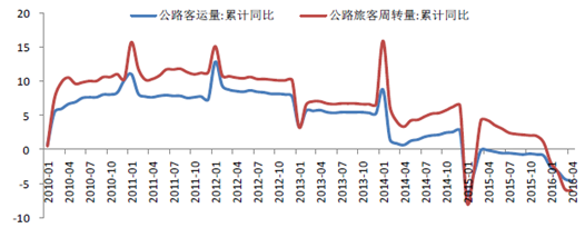 2010-2016年中國公路客運量、公路旅客周轉量累計同比增速