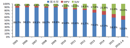 SUV 占狹義乘用車的比重由2015 年的31%提升至36%。SUV 不僅僅受益于增購換購需求, 同時也有越來越多的首次購車客戶選擇SUV。根據羅蘭貝格的2015 年年底的報告,在2016 年的潛在汽車消費調查中,潛在新購人群中有接近50%的人選擇SUV,而在增購和換購群體中, 這個比例更是高達58%以上。在新車型方面,全年SUV 市場預計有超過150 款改款和全新產品導入,SUV 市場競爭將更加激烈,降價將成為車企爭奪市場的主要手段。