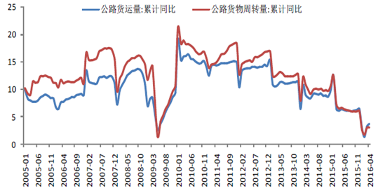 2005-2016年中國公路貨運量和公路貨物周轉量增速