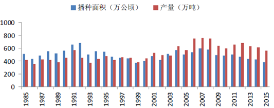 1985-2015年中國棉花播種面積和產量
