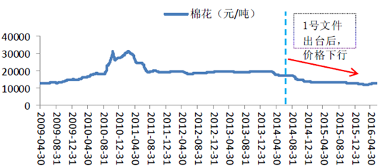 核心提示:2008年我國推出棉花臨儲政策,到2014年臨儲政策取消共持續8年時間。2013年6月傳出棉花目標價格制度傳聞以來,棉花期貨價格從超2萬元/噸一路下滑到1萬元/噸。2014年9月目標價開始后,棉花價格一路狂跌,從開始的1.7萬元/噸,迅速下2008年我國推出棉花臨儲政策,到2014年臨儲政策取消共持續8年時間。2013年6月傳出棉花目標價格制度傳聞以來,棉花期貨價格從超2萬元/噸一路下滑到1萬元/噸。2014年9月目標價開始后,棉花價格一路狂跌,從開始的1.7萬元/噸,迅速下滑到1.3萬元/噸。總體而言,隨著棉花目標價格制度推出,棉花種植面積和產量均出現下降,進口量出現斷崖式滑坡,庫存量開始逐步減少,基本達到政策預期。