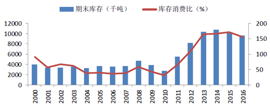 2000-2016年中國棉花庫存量和庫存消費比