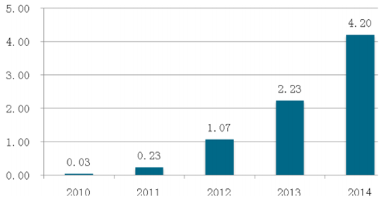 2010-2014 年中國個人云存儲用戶規模增長(億人)