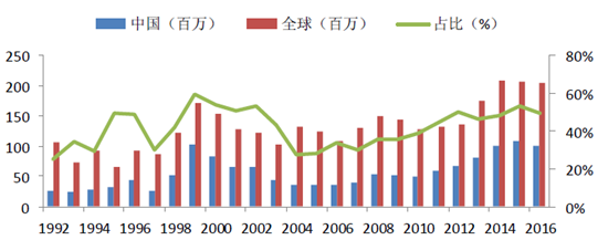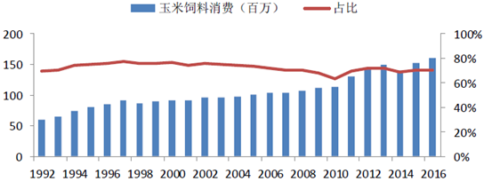 3、受臨儲政策支撐,國內玉米種植的相對收益較為可觀,種植面積增長迅速。2000-2015年,國內玉米產量由1.06億噸增長至2.25億噸,播種面積由3.46億畝增長至5.72億畝。其中在2012年,玉米產量首次超過水稻,成為我國第一大糧食作物品種;2014年,我國超越美國成為玉米種植面積最大的國家。