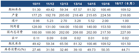 年份收儲量(萬噸)拍賣成交量(萬噸)期末庫存量(萬噸)12/1330831791129213/146919780743114/15832901576015/1610743026503中國庫存量與庫存占全球庫存比例