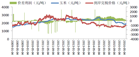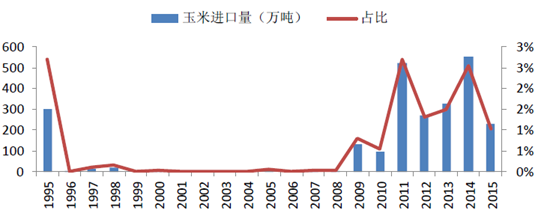 1、2004年以來,每年進口玉米配額的發放量基本穩定在720萬噸,配額的60%分配給國有企業。但是國內飼料生產企業有上萬家,99%為民營企業,其玉米消費量占總消費量的絕大部分,但是這些配額申請不易,私企很難拿到國外便宜的玉米,且申請的數量僅能滿足企業的生產,無法流入到市場中,。2016年的進口政策已經出臺,2016年玉米進口配額為720萬噸,配額數量占我國玉米消費量不足5%,國外的低價玉米很難沖擊到國內玉米市場。我們認為,考慮到近年來國家收儲大量玉米,2016年放開玉米配額政策亦不可能,因此未來玉米價格波動主要看國內供需情況及政策情況。