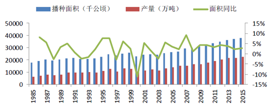 1985-2015年中國玉米播種面積、產量及播種面積增速
