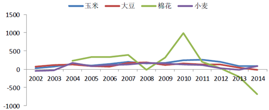 2002-2014年中國主要糧食作物每畝凈利潤(元)