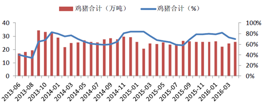 2016年開始,畜禽進入行業反轉周期,大的邏輯主要是供給側大幅減少,自上而下帶動產業鏈景氣行情。雖然目前較高的雞肉和豬肉價格豐厚養殖企業利潤,帶動養殖企業飼料需求增加,但是由于本輪雞、豬行情是由供給收縮帶動,祖代雞和生豬存欄量持續下滑,導致產業鏈上游飼料需求增加有限。我們預計2016年我國飼料產量絕對數量和相對增速都會有所增加,但幅度不會太大。