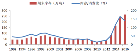 4、最低收購價通過指定企業托市收購,托起市場糧價,當市場糧食價格穩定在最低收購價之上即停止托市收購。但是在實際收購中,收購企業在多收購多賺取保管費等利益驅動下存在敞開收儲的傾向,導致農產品的庫存大幅上升。國內玉米庫存量自2010年以來快速增加,庫存消費比遠高于全球平均水平。