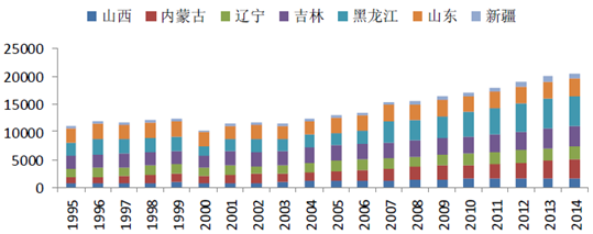 我國玉米在各地區的種植分布卻并不均衡,主要集中在東北、華北和西南地區,大致形成一個從東北到西南的斜長形玉米種植帶。種植面積較大的省份主要有黑龍江、吉林、河北、山東、河南、內蒙古、遼寧等省份,這8個省份玉米播種面積占到全國總播種面積的66%左右。