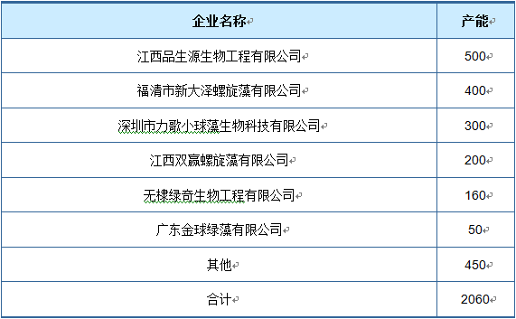核心提示:2015年我國綠藻生產企業數量近100家,大多數企業產能較小,產能超過100噸的約五家。2015年我國綠藻行業產能約2060噸,如下表所示:2015年中國主要綠藻企業產能情況(單位:噸)資料來源:公開資料整理2015年我國綠藻生產企業數量近100家,大多數企業產能較小,產能超過100噸的約五家。2015年我國綠藻行業產能約2060噸,如下表所示: