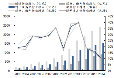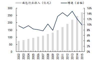 中國烘焙行業2003-2014年復合增速達25%;2014年,中國烘焙行業營業收入達2427億元,同比增長10.28%,其中糕點、面包子行業實現收入899億元,餅干及其他焙烤食品實現收入1527億元。估計2015年烘焙行業全年實現收入2670億元,同比增長10%。2015年,中國面包行業實現收入271億元。同比增長9.8%。未來增速有望繼續保持在10%左右,面包行業市場空間巨大。